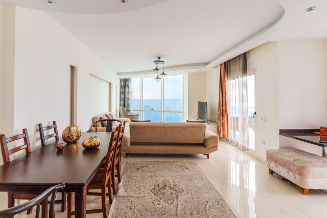 昼間は海の景色を取り込み、夜は重厚感のあるドレープを閉じて、昼夜で異なる雰囲気が楽しめる表情豊かなお部屋です。